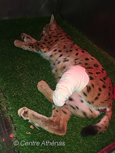 Lourdement blessée (sévère traumatisme crânien et fracture semi-ouverte du tibia gauche), elle aurait pu être victime d’un « sur-accident » si un automobiliste (M. BOUSSAUD) ne s’était pas arrêté pour garantir sa sécurité et nous contacter. Elle a été capturée en début de matinée et a immédiatement fait l’objet des soins que justifiait son état : traitement du traumatisme crânien et stabilisation en prévision de l’intervention chirurgicale qui doit avoir lieu après 48h.